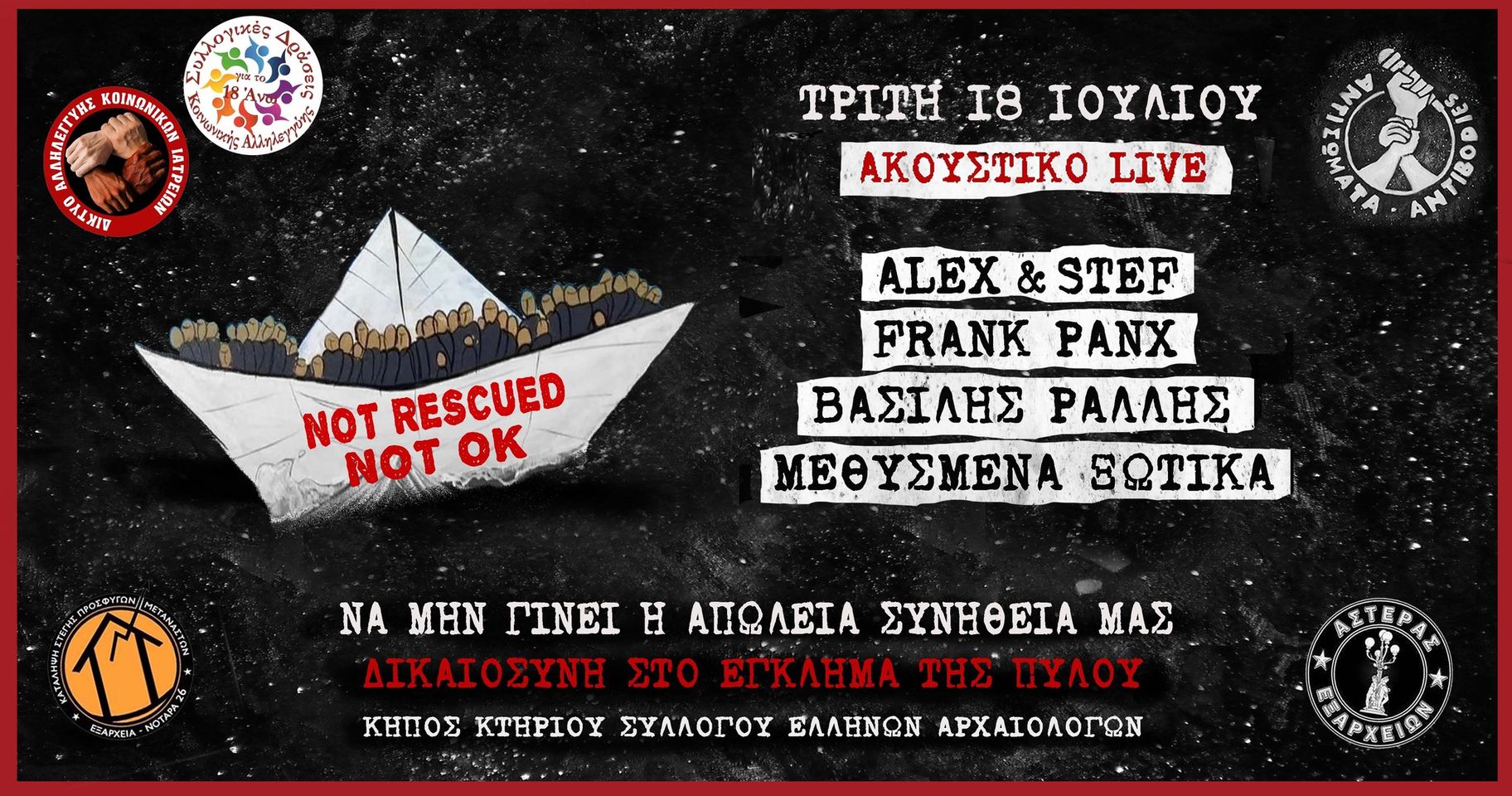 Η εκδήλωση θα ξεκινήσει στις 19.30 με εισηγήσεις για “Δικαιοσύνη για το έγκλημα της Πύλου” με ομιλητές τους Κατερίνα Μάτσα (Ψυχίατρος), πρωτοβουλία νομικών για το ναυάγιο της Πύλου, Θοδωρής Συμεωνίδης (δικηγόρος), Ιάσωνας Αποστολόπουλος (Διασώστης), Μαρία Παπαμηνά και μαρτυρίες από πρόσφυγες κ προσφύγισσες. Συντονισμός από τον Σταύρο Μαλιχούδη (περιοδικό Solomon που έκαναν κ την μεγάλη δημοσιογραφική έρευνα για το ναυάγιο).