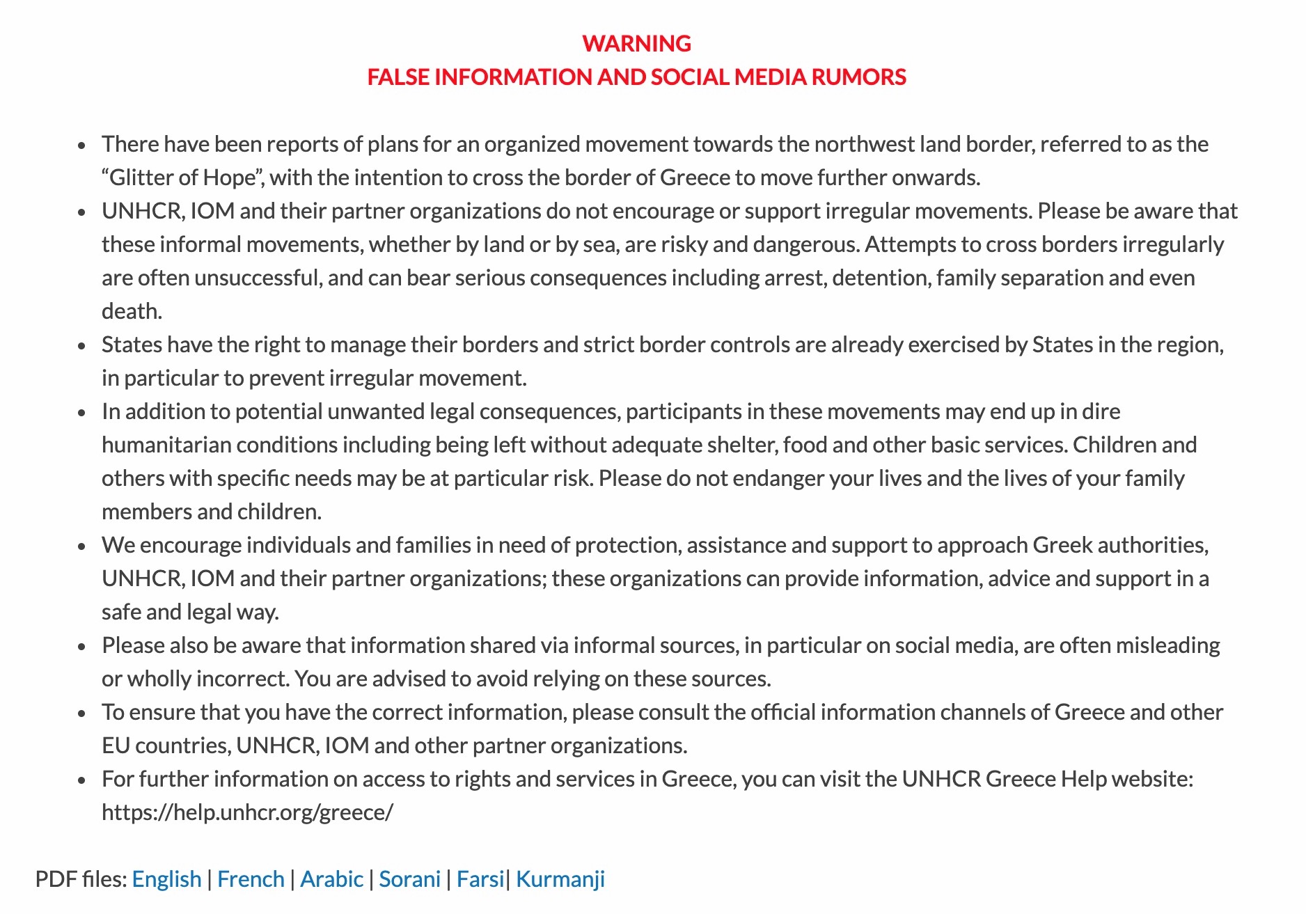 Λόγω της φημολογίας και της κινητικότητας των τελευταίων ημερών, η Ύπατη Αρμοστεία (UNHCR) μαζί με τον Διεθνή Οργανισμό Μετανάστευσης (ΔΟΜ) δημοσίευσαν από κοινού κείμενο με τίτλο «ΠΡΟΣΟΧΗ: ΨΕΥΔΕΙΣ ΠΛΗΡΟΦΟΡΙΕΣ ΚΑΙ ΦΗΜΕΣ ΣΤΑ SOCIAL MEDIA» όπου τονίζουν ότι το αποκαλούμενο καραβάνι δεν υποστηρίζεται από κανέναν επίσημο φορέα ή ανθρωπιστική οργάνωση και ότι υπάρχει μεγάλος κίνδυνος για όσους αποφασίσουν να διασχίσουν τα σύνορα παράτυπα.