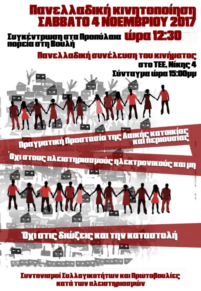 Οι επιτροπές πρωτοβουλίας και οι συντονισμοί συλλογικοτήτων κατά των πλειστηριασμών διοργανώνουν πανελλαδική συγκέντρωση στις 4 Νοέμβρη, 12:30 το μεσημέρι στα Προπύλαια και εν συνεχεία πορεία στην πλατεία Συντάγματος, όπου αναμένεται μεγάλη συμμετοχή και ήδη έχει αναπτυχθεί και η σχετική πολιτική καμπάνια σε όλη τη χώρα.