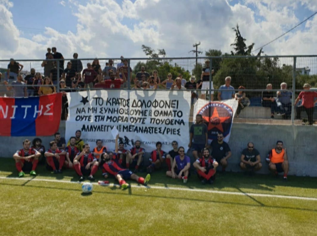 «Στο σημερινό αγώνα του ποδοσφαιρικού μας τμήματος απέναντι στον Κόροιβο για τη 1η αγωνιστική της Γ’ ΕΠΣ Ηρακλείου, η ομάδας μας πήρε θέση για τα τελευταία γεγονότα με τους νεκρούς στο σύγχρονο στρατόπεδο συγκέντρωσης της Μόριας. Αναρτήσαμε πανό αλληλεγγύης προς τους μετανάστες και ο διαιτητής αρνήθηκε να ξεκινήσει το παιχνίδι εάν δεν κατέβαινε από την κερκίδα. Σύμφωνα με τα λεγόμενά του το πανό έχει περιεχόμενο που είναι ενάντια στον κανονισμό ‘No politica’ στα γήπεδα.