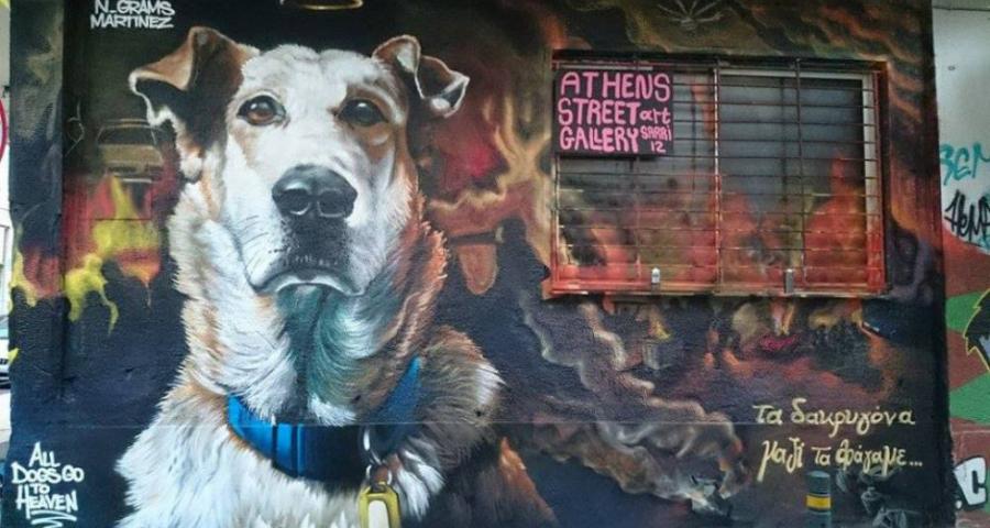 A wall mural of Loukanikos in the central area of Psyrri in Athens, signed by Martinez N. Gramms and Smart. It reads ‘we got tear-gassed together’ and ‘All dogs go to heaven’.