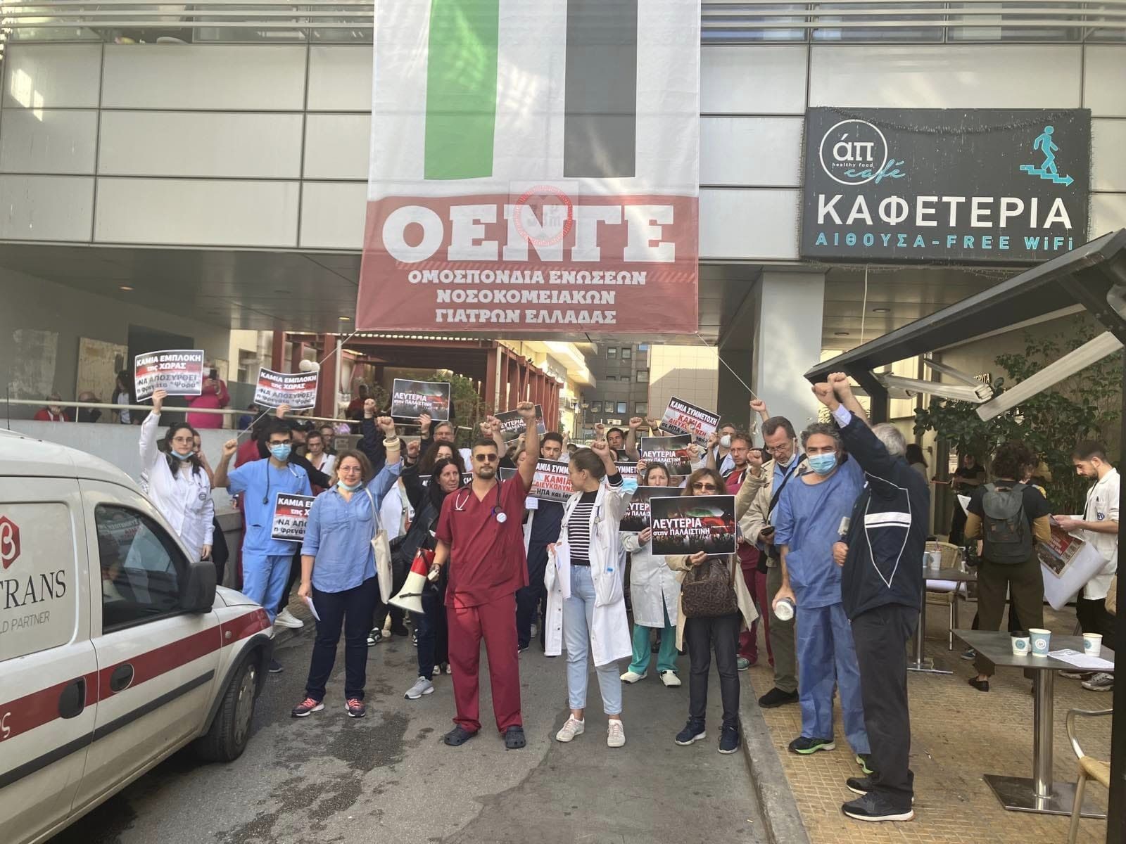 Η ΟΕΝΓΕ τονίζει «Οι εκεί συνάδελφοι λένε ότι δεν είναι πλέον ασφαλές μέρος για την περίθαλψη ασθενών. Απαιτούμε από την πολιτική ηγεσία του υπουργείου Υγείας να προχωρήσει σε όλες τις αναγκαίες ενέργειες ώστε να εξασφαλιστεί η ασφαλής απομάκρυνση γιατρών, υγειονομικών και ασθενών από τα νοσοκομεία της Λωρίδας της Γάζας. Να σταματήσει τώρα ο βομβαρδισμός των νοσοκομείων» και καλεί σε νέα κινητοποίηση αύριο Τετάρτη 15 Νοέμβρη στη 1 μ.μ. στο Νοσοκομείο της Νίκαιας.