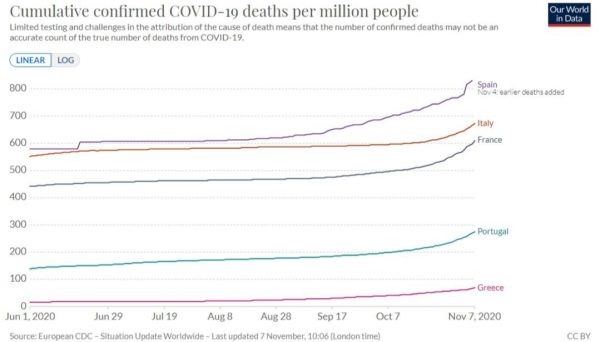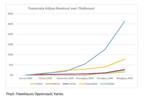 Παράλληλα, η Νέα Δημοκρατία σημειώνει ότι «επισυνάπτει το διάγραμμα των Syriza statistics που παρουσίασε στη τελευταία συνέντευξη τύπου του ο κ. Τσίπρας και το διάγραμμα του ECDC για τις ίδιες χώρες και την ίδια περίοδο».