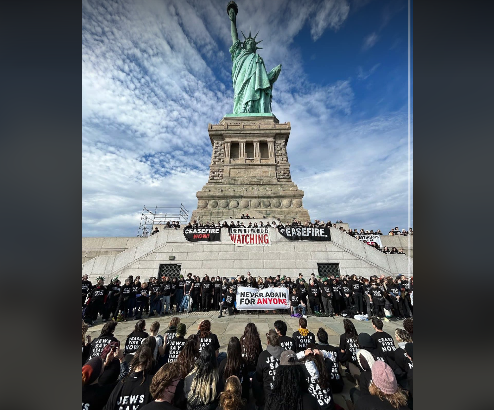 «Οι διάσημες λέξεις της Εβραίας προγόνου μας Έμα Λάζαρους που είναι χαραγμένες σ’ αυτό το μνημείο μας υποχρεώνουν να δράσουμε για να υποστηρίξουμε τους Παλαιστίνιους στη Γάζα που ποθούν να ανασάνουν ελεύθεροι», τόνισε σε ανακοίνωσή του ο Τζέι Σέιπερ, της οργάνωσης «Εβραϊκή Φωνή για την Ειρήνη» (Jewish Voice for Peace, JVP), ενώ το Ινστιτούτο για την Κατανόηση στη Μέση Ανατολή απαίτησε επίσης «να τερματιστεί ο γενοκτονικός βομβαρδισμός από το Ισραήλ Παλαιστινίων αμάχων στη Γάζα».