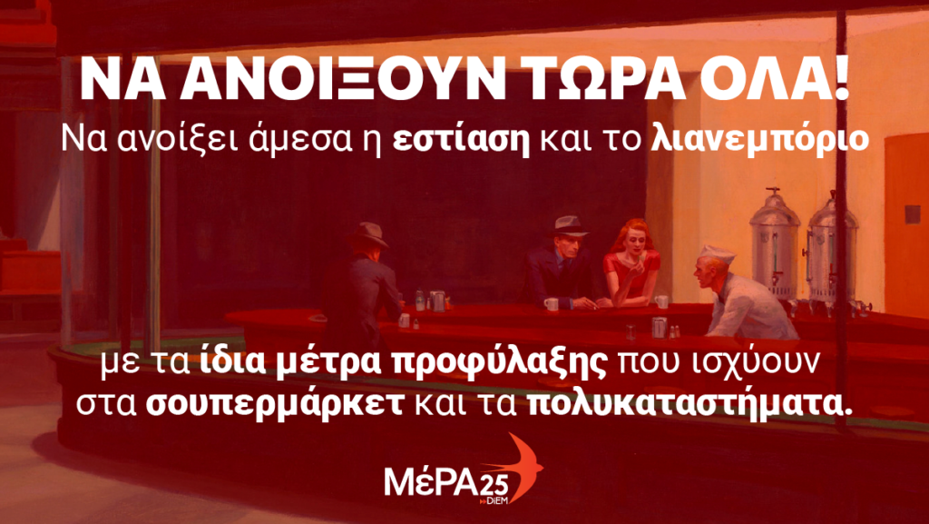 Αυτός ο εμπαιγμός της κυβέρνησης προς την κοινωνία, τους μικρομεσαίους και τους εργαζόμενους πρέπει να σταματήσει ΤΩΡΑ. Το ΜέΡΑ25 ζητάει να ανοίξει, αύριο κι όλας, το λιανεμπόριο και η εστίαση σε όλη τη χώρα με τα μέτρα και τους όρους που ισχύουν στα σουπερμάρκετ και τα πολυκαταστήματα. Ενώ ταυτόχρονα απαιτούμε το άνοιγμα του τουρισμού να γίνει με μοριακό τεστ 72 ωρών και rapid τεστ κατά την είσοδο στη χώρα».