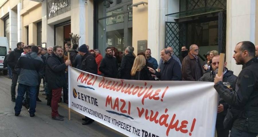 «Καταγγέλλουμε την Διοίκηση της Πειραιώς, η οποία ανακοίνωσε την απόλυση 120 εργαζομένων από τον κλάδο των καθαριστριών και των φυλάκων με αιτιολογία την υλοποίηση του πλάνου αναδιάρθρωσης της Τράπεζας. Η απόφαση αυτή της Πειραιώς αποτελεί μέρος του σχεδίου των τραπεζιτών για μείωση των τραπεζοϋπαλλήλων και για παραπέρα χτύπημα της μόνιμης και σταθερής εργασίας.
