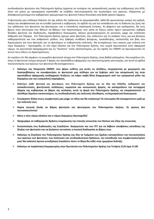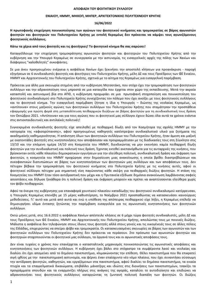 «Έτσι φτάνουμε στο σήμερα όπου 6 συνδικαλιστές και συνδικαλίστριες της Ενωτικής Πρωτοβουλίας, μέλη των διοικητικών συμβουλίων των φοιτητικών τους συλλόγων, συμπεριλαμβανομένου τους προέδρους του Ενιαίου, ΗΜΜΥ, και της Αρχιτεκτονικής, δέχτηκαν στα σπίτια τους κλητεύσεις από την ασφάλεια Χανίων για προανάκριση-παροχή εξηγήσεων σχετικά με το κάλεσμα της Κεραμέως για εισαγγελική παρέμβαση. Η Κεραμέως, σε συνεργασία με τον Καρυστινό, προσπαθεί όπως είναι εμφανές μέσα από το νόμο Κ-Χ, αλλά και ο νέος νόμος-πλαίσιο που σύσσωμη η ακαδημαϊκή κοινότητα έχει καταδικάσει, να τελειώσει με τους φοιτητικούς συλλόγους και τις κινητοποιήσεις τους μια για πάντα. Ακριβώς γιατί το φοιτητικό κίνημα ήταν αυτό που καταφέρνει να στέκεται εμπόδιο στις αυταρχικές αναδιαρθρώσεις που είναι ενάντια σε λαό και νεολαία. Τόσο οξυμένη επίθεση, όπου η ίδια η υπουργός να καταδιώκει ποινικά φοιτητές, έχουμε να δούμε από τη Χούντα. Μη ξεχνάμε βέβαια το ότι είναι οι ίδιοι που παραλίγο δεν σκότωσαν τον συνάδελφο μας Γιάννη Ντουσάκη με την κρότου λάμψης στο ΑΠΘ, και που εισέβαλαν αναίτια στο σπίτι συμφοιτητή μας από το ΗΜΜΥ πέρυσι. Οι στοχεύσεις της ΝΔ έχουν στο επίκεντρο την τρομοκράτηση των φοιτητών, την αστυνομοκρατία στα πανεπιστήμια και την κατάργηση την όποια ζωντανή συλλογική πολιτική διαδικασία! Δεν θα τους περάσει! Το φοιτητικό κίνημα θα βγει μπροστά και θα βάλει φρένο στις εξοντωτικές τους πολιτικές! ΣΤΟΥΣ ΦΟΙΤΗΤΕΣ ΔΕΝ ΠΙΑΝΟΥΝ ΑΠΕΙΛΕΣ ΚΑΤΩ ΤΑ ΧΕΡΙΑ ΑΠΟ ΤΟΥΣ ΑΓΩΝΙΣΤΕΣ!» καταλήγουν οι φοιτητές στην ανακοίνωση και καλούν σε παράσταση διαμαρτυρίας στην Πρυτανεία την Τετάρτη 21/06, 11.00 π.μ.