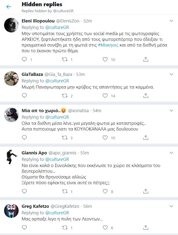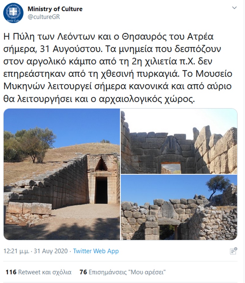 Ο επίσημος λογαριασμός του Υπουργείου Πολιτισμού δίνει ψευδείς, φωτογραφίες από τις "άκαυτες" Μυκήνες "σήμερα" και διαγράφει όσες απαντήσεις δείχνουν το αντίθετο! Δεν αντέχεται πια τόση Δημοκρατία…