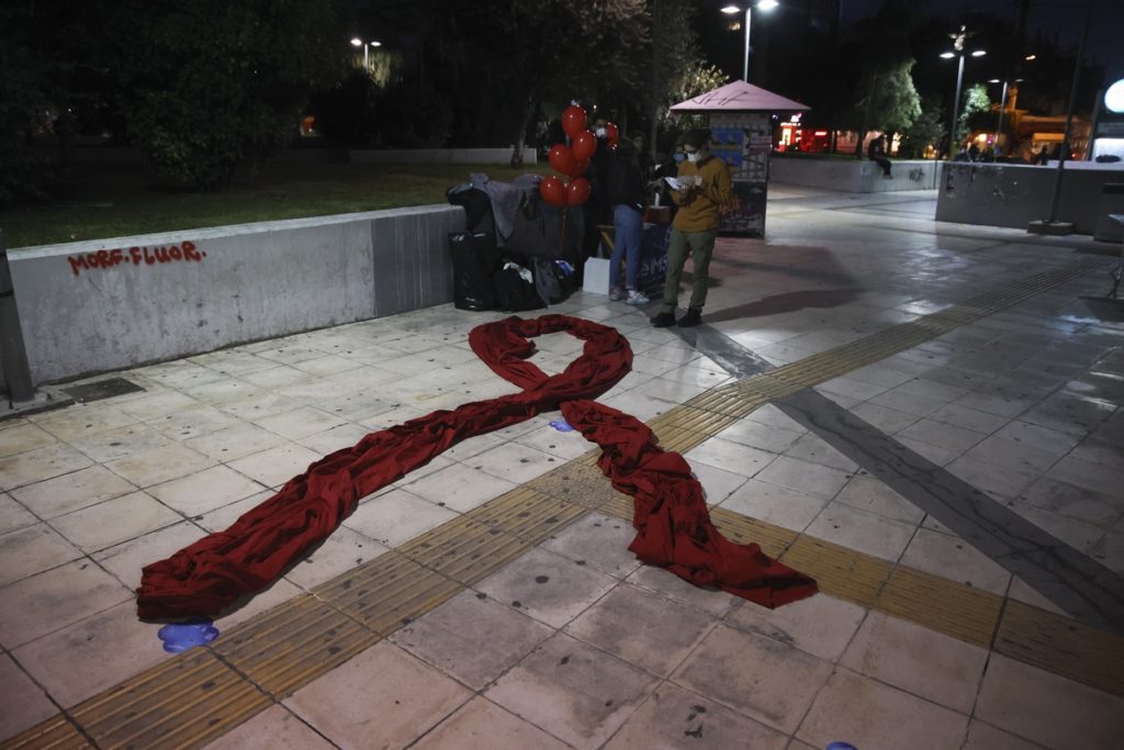 Λίγο πριν τις 22:00, μέλη του Συλλόγου Οροθετικών Ελλάδος «Θετική Φωνή» και φοιτητές Ιατρικής της Πανελλήνιας Οργάνωσης Φοιτητών Ιατρικής (Helmsic) άναψαν κόκκινα κεριά στέλνοντας το δικό τους μήνυμα για το AIDS.