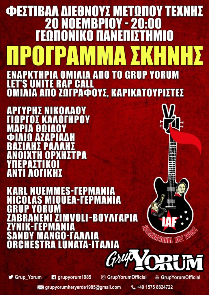 Από σκηνής θα τραγουδήσουν οι Αργύρης Νικολάου, Γιώργος Καλογήρου, Μαρία Θωίδου, Φιλιώ Αζαριάδη, Βασίλης Ράλλης, Ανοιχτή Ορχήστρα, Υπεραστικοί, Αντί Λογικής, Karl Nuemmes και Nicolas Miquea από Γερμανία, Grup Yorum, Zambraneni Zimvoli από Βουλβαρία, Zynik από Γερμανία, Sandy Mango από Γαλλία και Orchestra Lunata από Ιταλία.