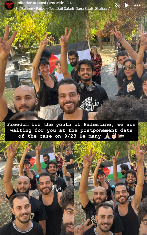 Στη σελίδα των Παλαιστινίων που βρίσκονται κάθε μέρα στο Σύνταγμα αντιδρώντας στη γενοκτονία και τη συνενοχή της ελληνικής κυβέρνησης, «Initiative against genocide», δημοσίευσαν φωτογραφία μαζί με αλληλέγγυους/ες που βρέθηκαν στην Ευελπίδων, αναφέροντας ότι με την αλληλεγγύη όλα είναι δυνατά και ότι αφέθηκαν ελεύθεροι. Ακόμα, καλούν τον κόσμο να βρεθεί στο πλάι τους στο επόμενο «ραντεβού» στις 23 Σεπτεμβρίου.