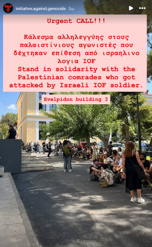«Το Σάββατο 13.9.2025 στην πλατεία Συντάγματος ένας άνδρας και μια γυναίκα από το Ισραήλ δημιούργησαν επεισόδιο στο σημείο που για μήνες Παλαιστίνιοι στο πλαίσιο της Πρωτοβουλίας Gaza is here διαμαρτύρονται απολύτως ειρηνικά για τη συντελούμενη γενοκτονία στη Γάζα και θρηνούν τους νεκρούς συγγενείς τους, δίπλα στα γραμμένα ονόματα των ανθρώπων που χάθηκαν στο έγκλημα των Τεμπών.