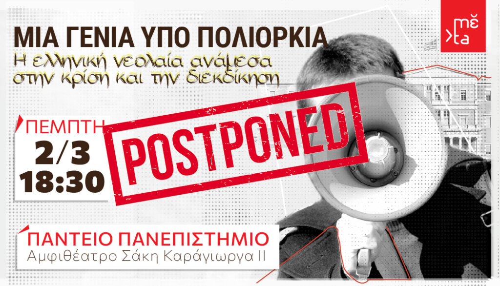 Η ημερίδα με θέμα «Μια γενιά υπό πολιορκία: Η νεολαία μεταξύ κρίσης και διεκδίκησης» θα πραγματοποιούταν από το Πάντειο Πανεπιστήμιο και το mέta | Κέντρο Μετακαπιταλιστικού Πολιτισμού την Πέμπτη 2 Μαρτίου από τις 6.30 μ.μ. στο αμφιθέατρο «Σάκης Καράγιωργας ΙΙ» του Παντείου, με τη φιλοδοξία μιας συνθετικής ματιάς στο ασφυκτικό τοπίο που δημιουργούν η εκπαιδευτική αντιμεταρρύθμιση, οι μίζερες εργασιακές προοπτικές, ο εκπατρισμός των νέων, η πανταχού παρούσα καταστολή, η εμπορευματοποίηση του ελεύθερου χρόνου, η πολιτική αφωνία.