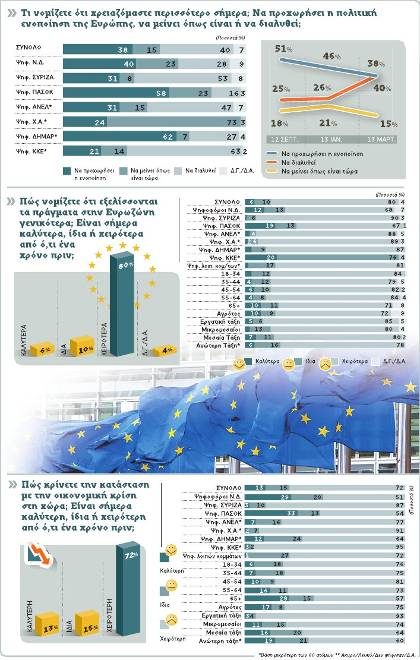 Η ελληνική κοινή γνώμη εμφανίζεται διχασμένη έναντι της Ευρώπης. Το 38% ζητεί να προχωρήσει η πολιτική ενοποίηση της Ε.Ε., ενώ το 40,4% ζητεί τη διάλυσή της, όταν ένα μήνα πριν ο ίδιος συσχετισμός ήταν 45,6% υπέρ της πολιτικής ενοποίησης της Ε.Ε. και 25,9% υπέρ της διάλυσής της!