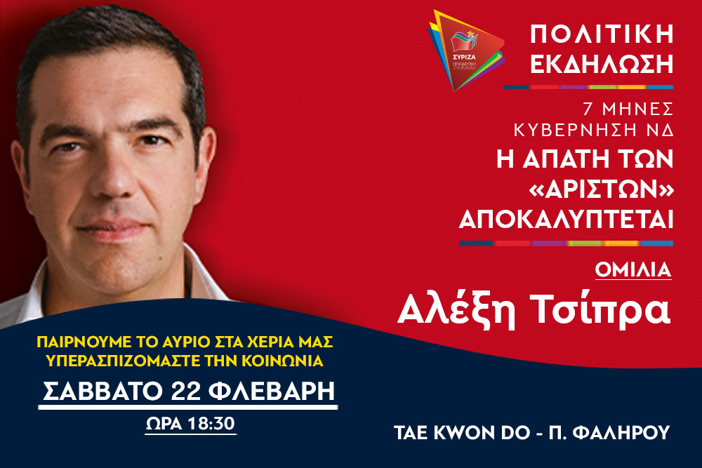 Πολιτική εκδήλωση με σύνθημα «Παίρνουμε το αύριο στα χέρια μας, υπερασπιζόμαστε την κοινωνία» πραγματοποιείται το Σάββατο στο Tae Kwon Do υπό την σημαία του «ΣΥΡΙΖΑ – Προοδευτική Συμμαχία», με ομιλητή τον Αλέξη Τσίπρα και τις πληροφορίες να θέλουν τη «Μαύρη Βίβλο» της κυβέρνησης Μητσοτάκη να ξεδιπλώνεται, τόσο κατά την ομιλία του, όσο και με τη χρήση σχετικών βίντεο.