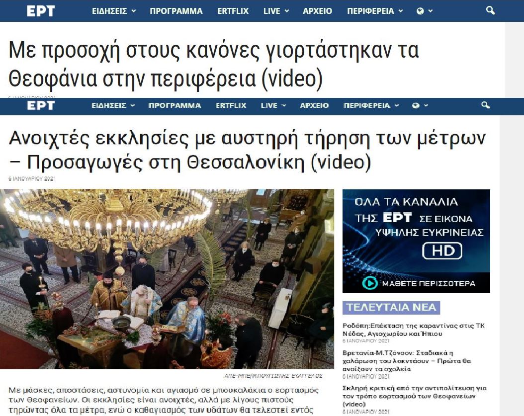 «Διαφορετικά από κάθε άλλη χρονιά, χωρίς αγιασμό των υδάτων ή με την ρίψη του σταυρού σε κάποιες περιπτώσεις στις κολυμπήθρες, με δεξαμενές έξω από τους ναούς για να πάρουν οι πιστοί αγιασμό, με αντίδωρο κλεισμένο προσεκτικά σε σακουλάκια και έντονη την παρουσία αστυνομικής δύναμης έξω από τους ναούς. Ο καθαγιασμός των υδάτων έγινε εντός των ναών, ενώ οι εκκλησίες θα είναι ανοιχτές μέχρι το βράδυ για αγίασμα και προσκύνημα» λέει χαρακτηριστικά το διαδικτυακό ρεπορτάζ της ΕΡΤ. «Με μάσκες, αποστάσεις, αστυνομία και αγιασμό σε μπουκαλάκια ο εορτασμός των Θεοφανείων», προσθέτει.
