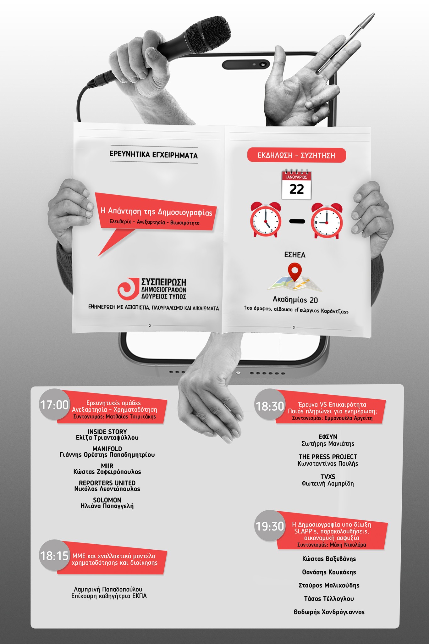 19:30 Η Δημοσιογραφία υπό δίωξη. SLAPPs, παρακολουθήσεις, οικονομική ασφυξία.