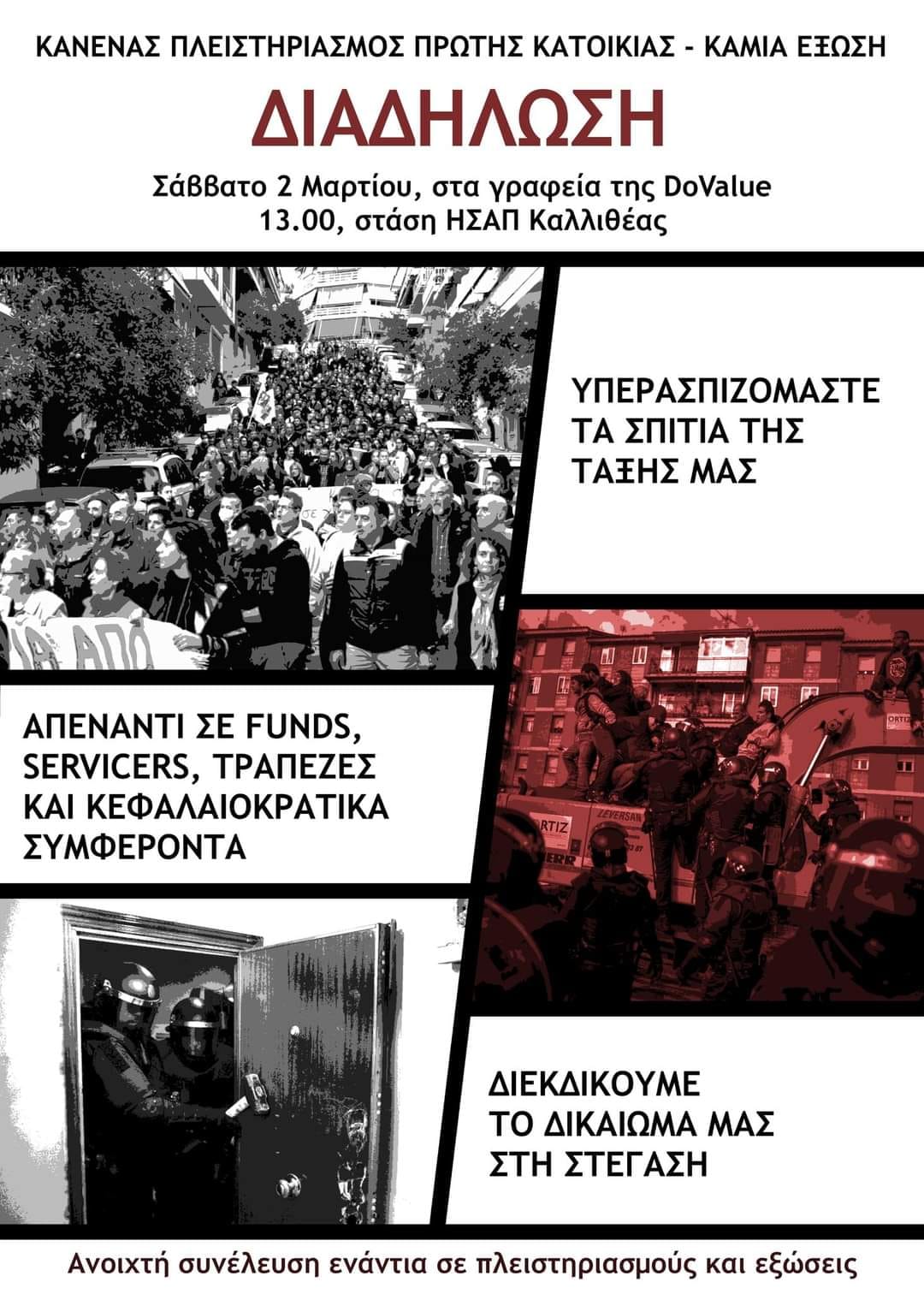 Οφείλουμε να αναλάβουμε δράση, να οργανωθούμε στις γειτονιές μας μαζικοποιώντας τις αντιστάσεις μας, αποτρέποντας στην πράξη τις εξώσεις και την αρπαγή των κατοικιών μας. Από την άλλη, να διεκδικήσουμε σε κεντρικό πολιτικό επίπεδο την προστασία της λαϊκής κατοικίας, την κατάδειξη και την στοχοποίηση των άμεσα υπεύθυνων της επίθεσης αυτής, που δεν είναι άλλοι από τα funds, τους servicers, τους εκάστοτε κυβερνώντες και το κεφαλαιοκρατικό σύστημα.