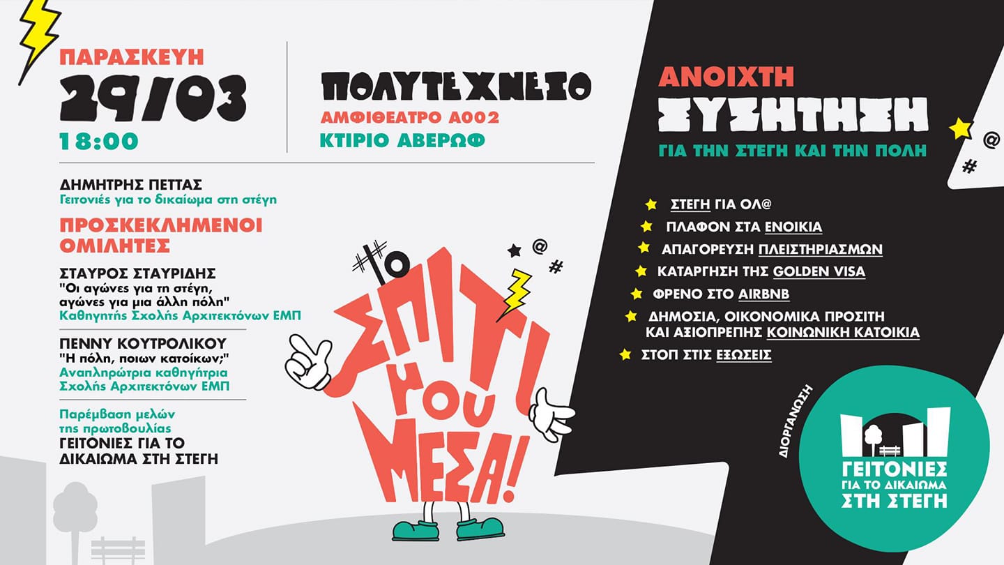 «Το θεμελιώδες δικαίωμα στη στέγαση απειλείται ολοένα και περισσότερο από την ραγδαία αύξηση των ενοικίων και του κόστους διαβίωσης, την “τουριστικοποίηση” και την αύξηση των ανισοτήτων. Στην Ελλάδα, περισσότερο από κάθε άλλη χώρα στην Ευρώπη, πολλά νοικοκυριά δίνουν το μισό τους εισόδημα για ανάγκες στέγασης. Όλα μας έχουμε βιώσει την απώλεια στέγης, είτε δικιάς μας, είτε φίλων και συγγενών μας. Έχουμε χάσει τα σπίτια μας, τις γειτόνισσες μας, τη βάση μας, καθώς κάτοικοι εκτοπίζονται και γειτονιές αποσυντίθενται» αναφέρει η πολυσυλλεκτική πρωτοβουλία ατόμων, ομάδων και κινημάτων για το δικαίωμα στη στέγη και τους ελεύθερους χώρους «Γειτονιές για το Δικαίωμα στη Στέγη».