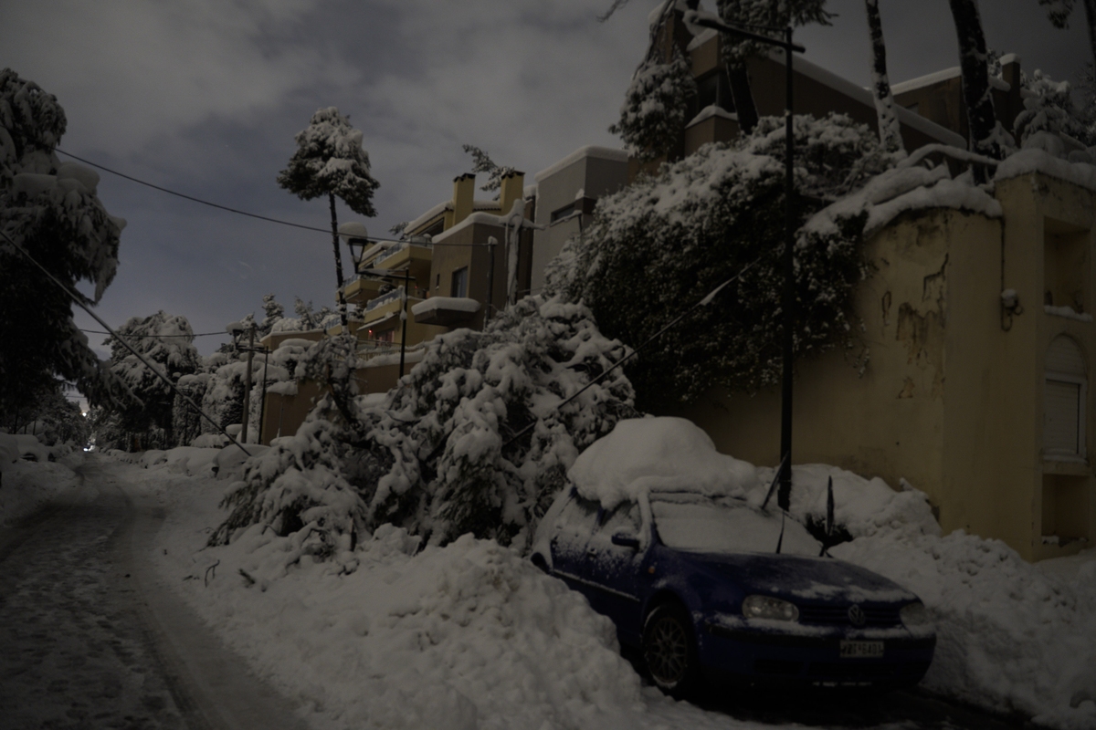 Σημειώνει επίσης ότι η σφοδρή χιονόπτωση που έπληξε τις περιοχές των Βορείων Προαστίων, συνεχίζει να προκαλεί πτώσεις δέντρων λόγω του συσσωρευμένου όγκου χιονιού.