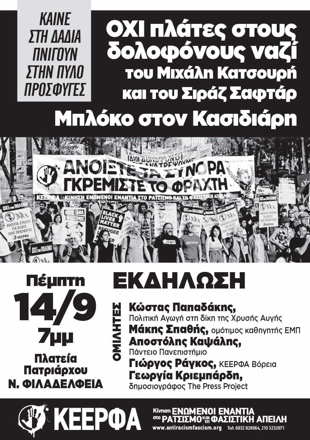 STOP στην κυβέρνηση που κάνει πλάτη στους ναζί του Κασιδιάρη, στους δολοφόνους του Μιχάλη Κατσουρή και του Σιζάρ Σαφτάρ», αναφέρεται στο κάλεσμα της εκδήλωσης.