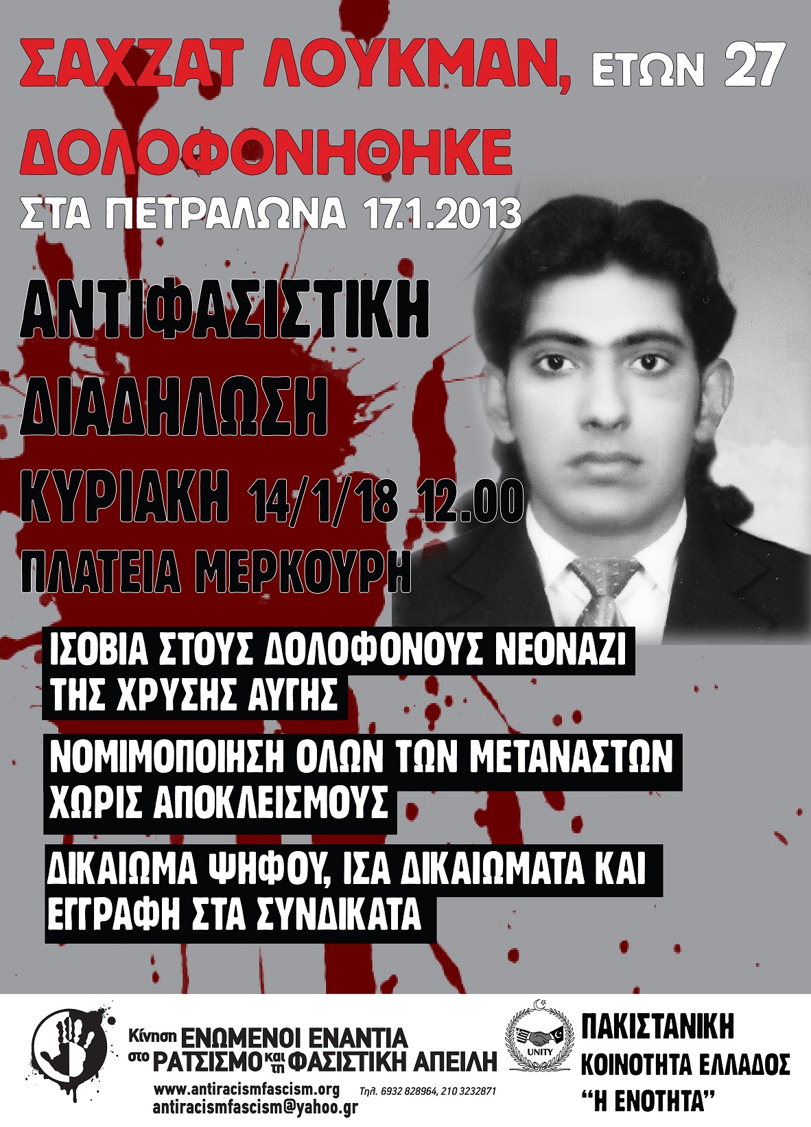 Σε αντιφασιστική συγκέντρωση στα Πετράλωνα καλούν την Κυριακή 14 Ιανουαρίου η Κίνηση Ενωμένοι Ενάντια στον Ρατσισμό και τη Φασιστική Απειλή (ΚΕΕΡΦΑ) και η Πακιστανική Κοινότητα καθώς πέντε χρόνια έχουν σημειωθεί από τη δολοφονία του πακιστανού εργάτη Σαχζάτ Λουκμάν.