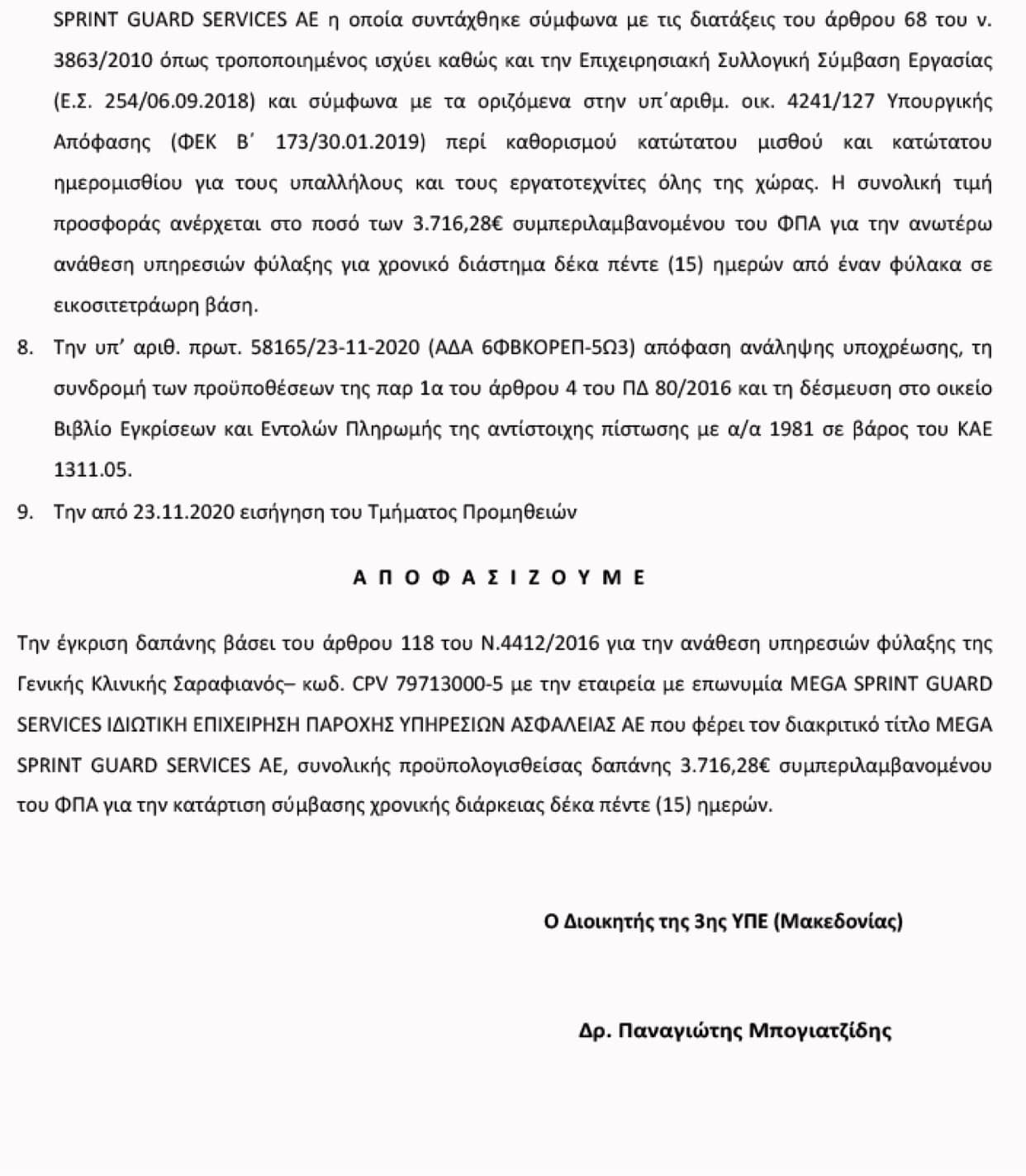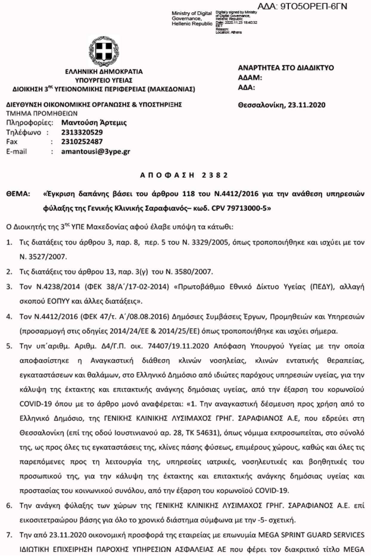 Σύμφωνα με το έγγραφο που δημοσίευσε η Δώρα Αυγέρη στα κοινωνικά δίκτυα, η 3η Υγειονομικής Περιφέρεια Μακεδονίας ενέκρινε ποσό 3.716 ευρώ για τη φύλαξη της ιδιωτικής κλινικής «Σαραφιανός», για την οποία υπενθυμίζεται πως ο ιδιοκτήτης της είχει δηλώσει ευθαρσώς πως αρκετοί εργαζόμενοι βρίσκονταν σε αναστολή εργασίας. Πρόκειται για την εταιρεία «MEGA SPRINT GUARD ΙΔΙΩΤΙΚΗ ΕΠΙΧΕΙΡΗΣΗ ΠΑΡΟΧΗΣ ΥΠΗΡΕΣΙΩΝ ΑΣΦΑΛΕΙΑΣ ΑΝΩΝΥΜΗ ΕΤΑΙΡΙΑ», η οποία αναλαμβάνει τη φύλαξη για διάστημα 15 ημερών.