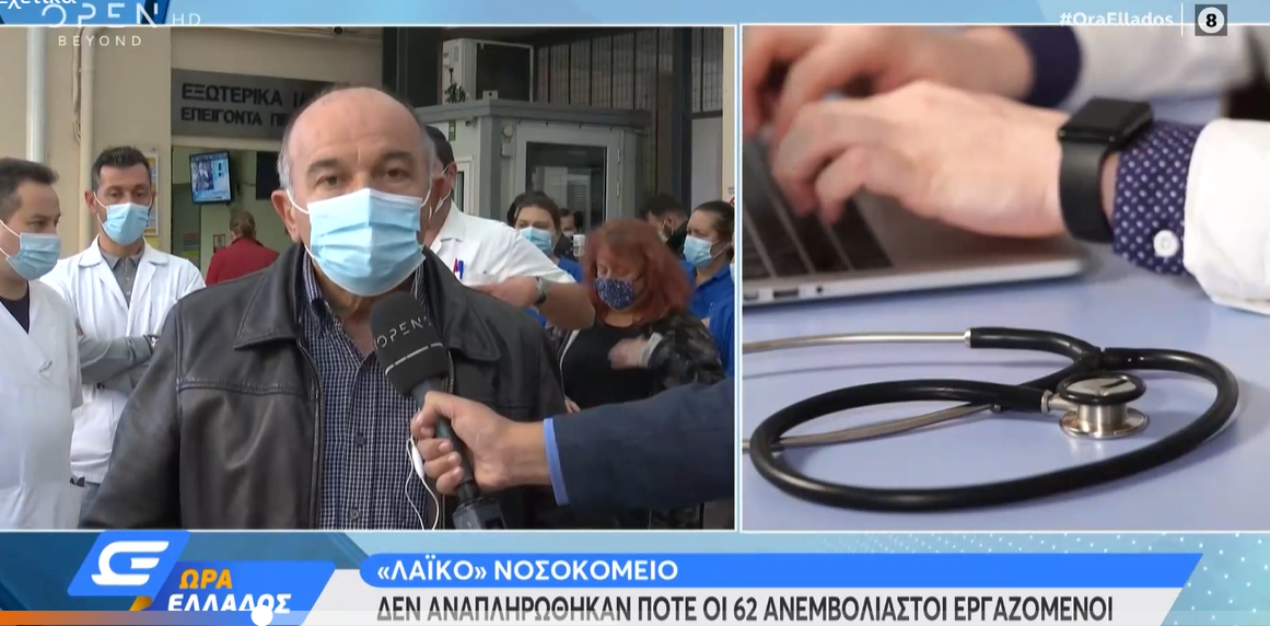 Σύμφωνα με τον Τ. Αντωνόπουλο, το ίδιο γίνεται σε όλα τα νοσοκομεία της χώρας. «Οι εργαζόμενοι λέμε ότι δεν πάει άλλο» τόνισε κάνοντας λόγο για ευθύνες της κυβέρνησης. «Θέλουμε χθες να αντικατασταθούν οι 100 εργαζόμενοι που λείπουν. Είμαστε εξουθενωμένοι. Είναι σαν να έχουμε τρέξει 3 μαραθώνιους με τα τρία κύματα και μας ζητάνε να τρέξουμε καινούργιο μαραθώνιο με τις ίδιες και λιγότερες δυνάμεις χωρίς να μας βοηθάει κανένας» υπογράμμισε.