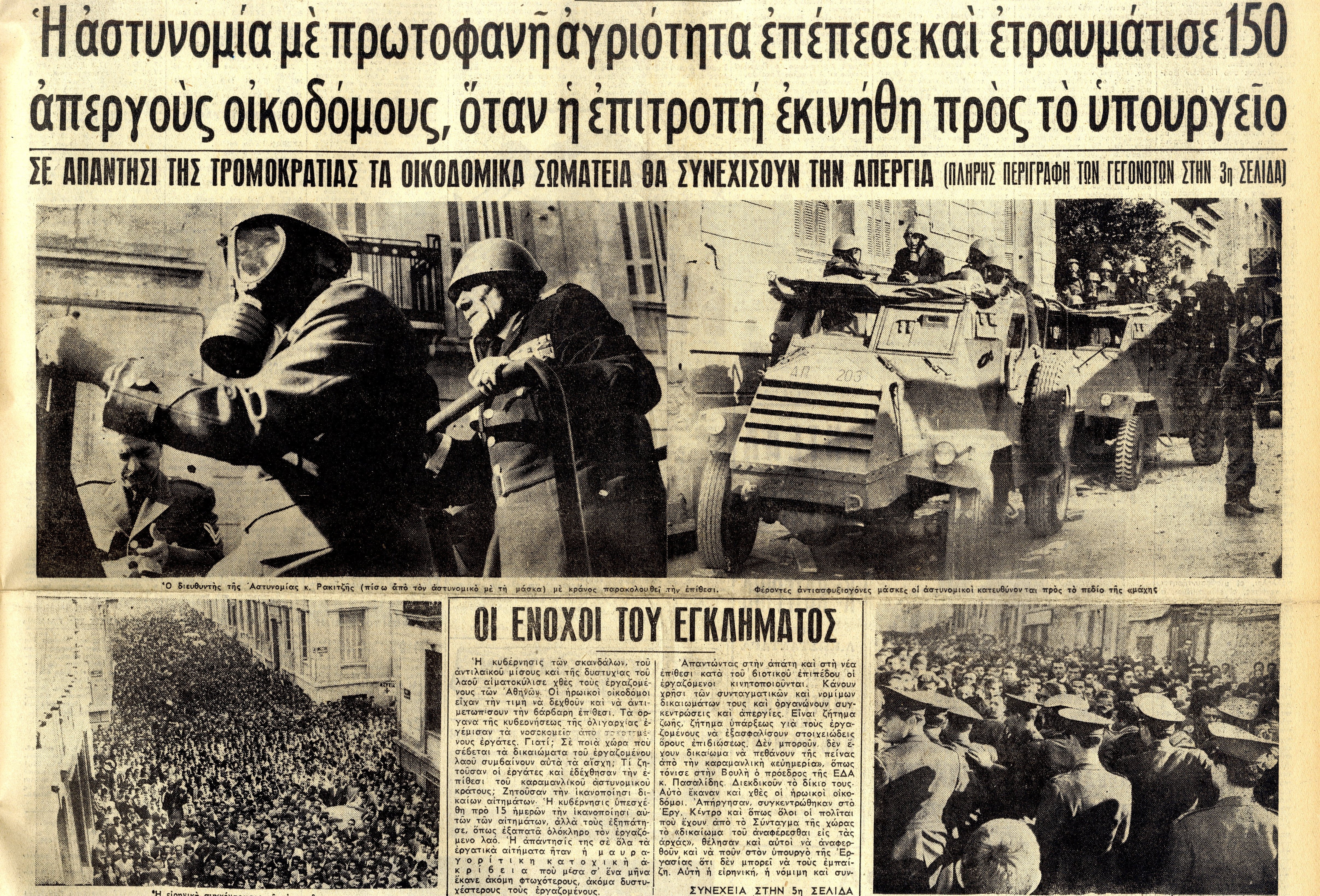 Η εντελώς απρόκλητη αυτή επίθεσις των αστυνομικών εναντίον ενός πλήθους που διαδήλωνε ειρηνικά την αγανάκτησή του για τον εμπαιγμό που υφίσταται, προκαλεί φοβερή οργή. Γυναίκες που από τα παράθυρα των γύρω σπιτιών παρακολουθούν τις σκηνές φωνάζουν: ‘Χειρότερα από τους Γερμανούς’! Ενώ η επίθεσις των αστυνομικών συνεχίζεται εναντίον των εργατών που κουβαλούν στους ώμους τους τραυματισμένους συναδέλφους τους, η μάζα των απεργών ανασυντάσσεται μπροστά στο Εργατικό Κέντρο και όταν οι αστυνομικοί επιτίθενται εκ νέου για να τους διαλύσουν οι οικοδόμοι αμύνονται απεγνωσμένα και προσπαθούν με τα σώματά των να συγκρατήσουν την επίθεση. Τα κτυπήματα με τα κλόμπς δεν σταματούν ούτε στιγμή. Αστυνομικά αυτοκίνητα σφυρίζοντας δαιμονισμένα φθάνουν στον τόπο των επεισοδίων και αδειάζουν συνεχώς αστυνομικούς. Στην οδόν Πειραιώς, στο ύψος της πλατείας Ωδείου, καταφθάνουν μεγάλα στρατιωτικά αυτοκίνητα γεμάτα στρατό. Οι στρατιώτες κατέρχονται και προχωρούν με τα όπλα προταγμένα και σε σχηματισμό μάχης.