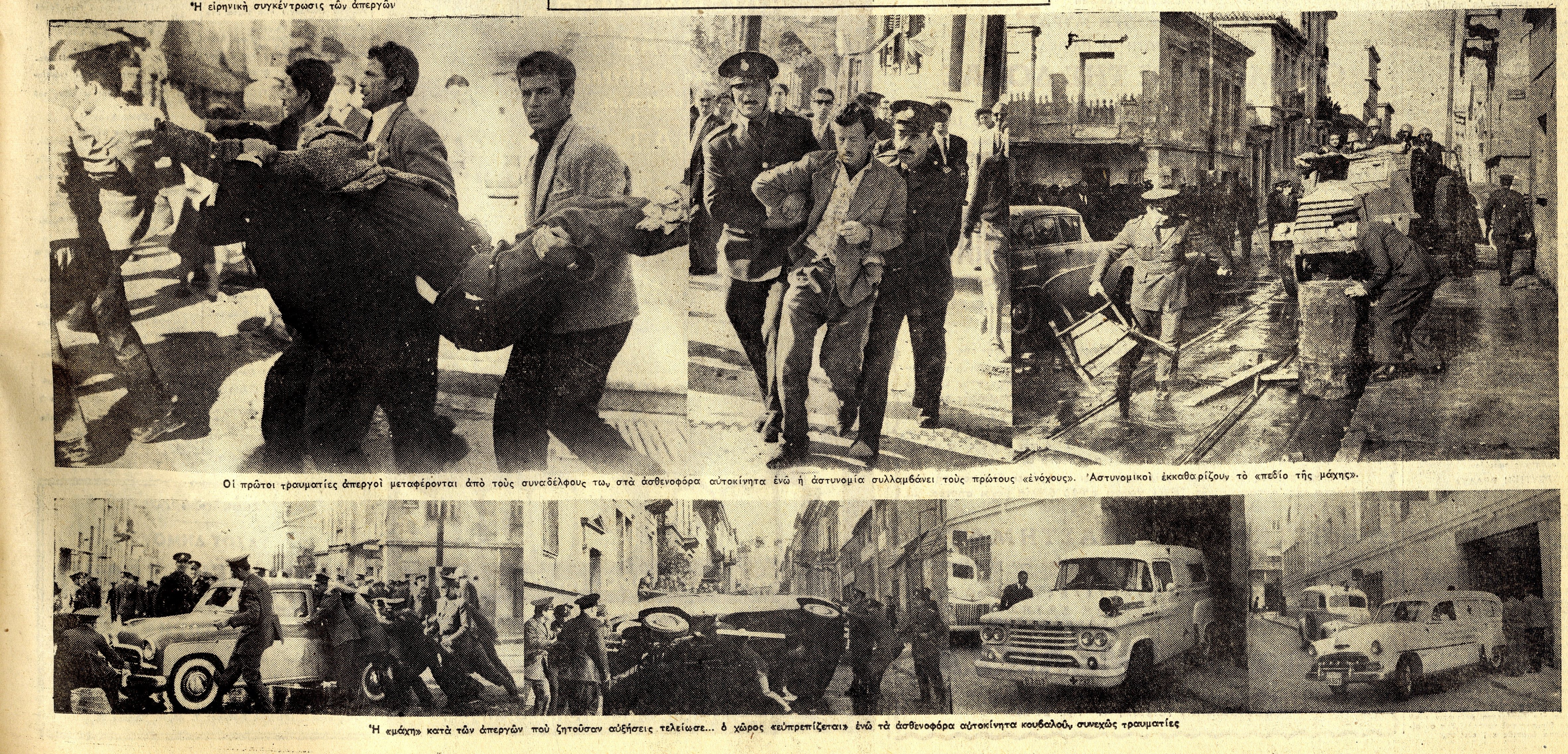 Οι υποχωρούντες απεργοί επιδιώκουν να φθάσουν στο κτίριο του ΕΚΑ. Στην ‘μάχη’ που εξακολουθεί οι αστυνομικοί τρέπονται εις φυγήν αφήνοντας την οδό Αγησιλάου ελεύθερη. Ο δρόμος παρουσιάζει ένα άγριο θέαμα καθώς είναι καλυμμένος από πέτρες, φέιγ-βολάν, από αίματα και από καπέλα αστυφυλάκων και αστυνόμων που τα εγκατέλειψαν κατά την φυγήν των. Το πανδαιμόνιο που κάνουν οι σειρήνες των αστυνομικών αυτοκινήτων, των πυροσβεστικών αντλιών και των ασθενοφόρων αυτοκινήτων που αρχίζουν να καταφθάνουν, οι κραυγές διαμαρτυρίας των απεργών, οι οιμωγές των τραυματισμένων δημιουργούν μια εφιαλτική ατμόσφαιρα.»