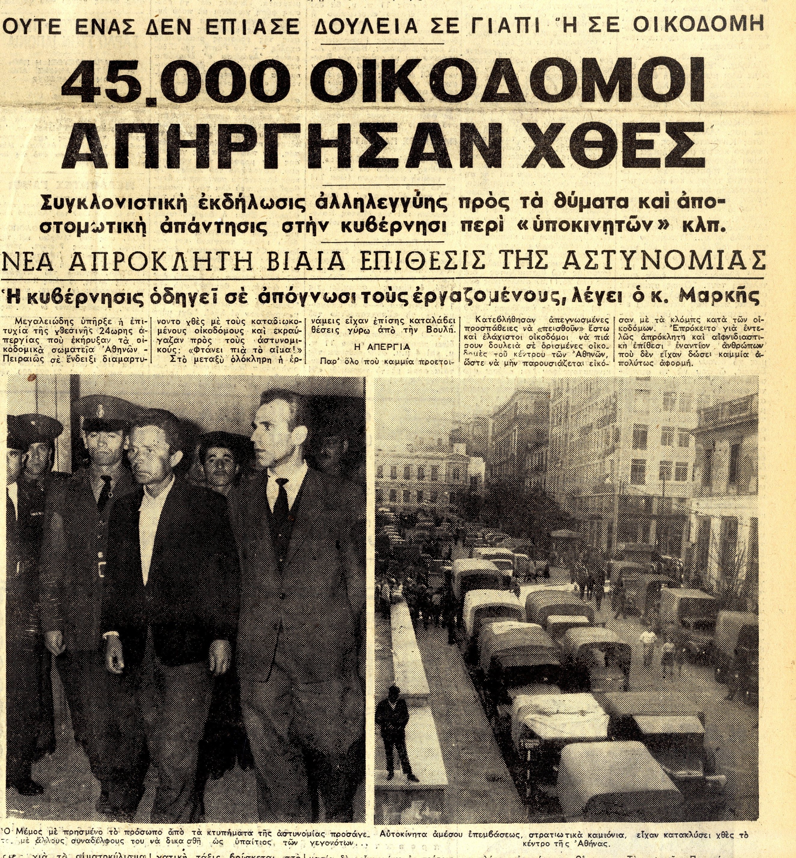Κατεβλήθησαν απεγνωσμένες προσπάθειες να ‘πεισθούν’ έστω και ελάχιστοι οικοδόμοι να πιάσουν δουλειά σε ορισμένες οικοδομές του κέντρου των Αθηνών, ώστε να μην παρουσιάζεται εικόνα πλήρους ερημώσεως. Οι προσπάθειες αυτές απέτυχαν. Από το πρωί, ομάδες αστυνομικών ευρίσκοντο έξω από τις μεγάλες κεντρικές οικοδομές και διενήργησαν συλλήψεις οικοδόμων που περνούσαν από κει. Ισχυρές επίσης αστυνομικές δυνάμεις είχαν καταλάβει θέσεις στην Ομόνοια και στους γύρω δρόμους. Το Εργατικό Κέντρο Αθηνών είχε αποκλεισθεί από αστυνομικούς και απηγορεύετο η είσοδος εργατών…Κατά τη διάρκεια των επεισοδίων ενεφανίσθησαν στην Ομόνοια και καμιόνια με στρατό».