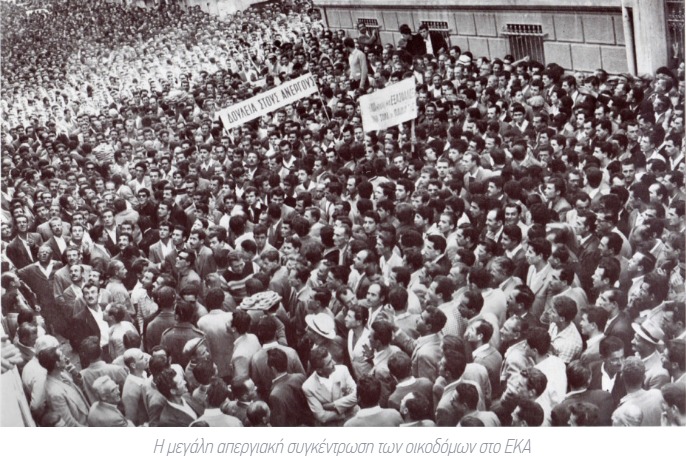 Σ” αυτή την ξέφρενη πορεία το εργατικό κίνημα παρέσυρε και άλλα πληβειακά στρώματα και κορυφώθηκε το Μάη του ’63 στην κηδεία του Γρηγόρη Λαμπράκη. Το αποτέλεσμα ήταν να σαρωθεί η κυβέρνηση Καραμανλή και να κερδίσει τις εκλογές ο Γεώργιος Παπανδρέου με την Ένωση Κέντρου (ΕΚ).»