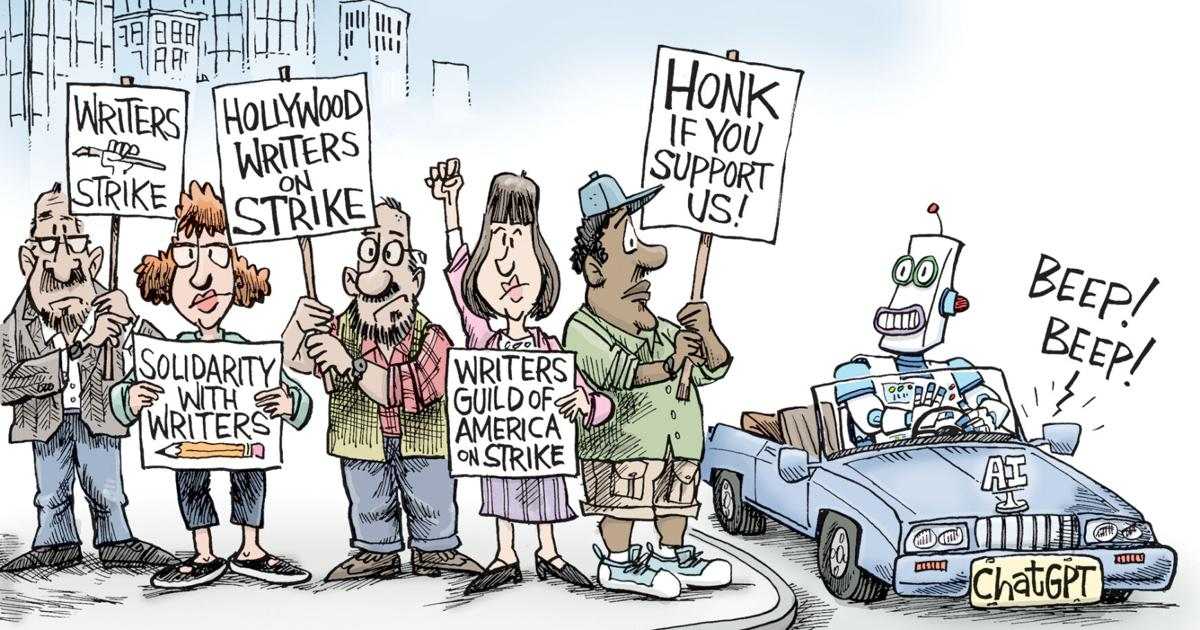 Το κερασάκι στην τούρτα ήρθε με την εισβολή της τεχνητής νοημοσύνης σχεδόν σε όλες τις εργασίες της καλλιτεχνικής μαζικής παραγωγής που λαμβάνουν χώρα στα μεγάλα κινηματογραφικά studio, και την εκβιαστική απειλή της αντικατάστασης της εργασίας των πραγματικών δημιουργών με κατασκευασμένα σενάρια βγαλμένα απευθείας από το μίξερ του ΑΙ. Το συγκεκριμένο ζήτημα αποτελεί ένα από τα βασικά αιτήματα των σεναριογράφων στην τωρινή απεργία τους, που εκτός από καλύτερες συμβάσεις εργασίας, τις αποζημιώσεις και την αύξηση μισθών, μεγάλο κομμάτι των διεκδικήσεων τους αφορά γενικά την ψηφιακή χρήση των έργων τους και τη γενικότερη ρύθμιση και οριοθέτηση της χρήσης της ψηφιακής τεχνολογίας στο καλλιτεχνικό πεδίο.