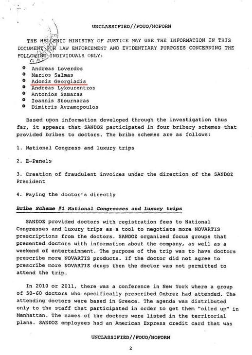 Ο υπουργός απάντησε ότι μετά από δικαστήριο η Novartis του ζητούσε «συγγνώμη», με τον Δ. Χατζηνικόλα να επισημαίνει ότι προφανώς δεν θα τον ενέπλεκε η Novartis αλλά το αμερικανικό υπουργείο Δικαιοσύνης, επικαλούμενο το σχετικό έγγραφο. Ο Α. Γεωργιάδης επιτέθηκε στον δημοσιογράφο, απειλώντας τον ότι θα του κάνει μήνυση και σύμφωνα με υπολογισμούς του, θα του ζητούσε 100.000€.