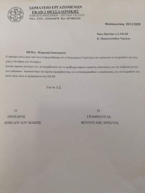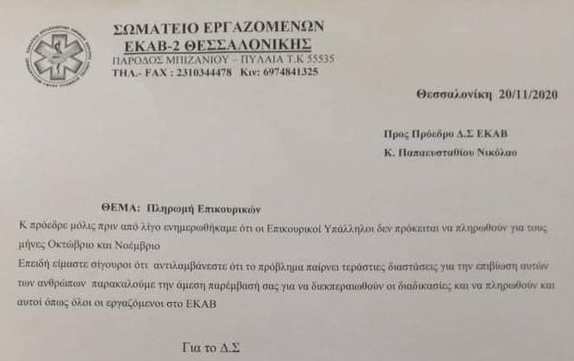 Συγκεκριμένα, σύμφωνα με την επιστολή του προέδρου του Σωματείου Εργαζομένων ΕΚΑΒ-2 Θεσσαλονίκης Μάκης Δεβελόγλου, οι επικουρικοί υπάλληλοι ενημερώθηκαν πως δε θα πληρωθούν για τους μήνες Οκτώβριο και Νοέμβριο. Στην επιστολή του προς τον πρόεδρο του ΕΚΑΒ, ο Πρόεδρος του Σωματείου ργαζομένων ζητά άμεση παρέμβαση για να λυθεί το πρόβλημα.