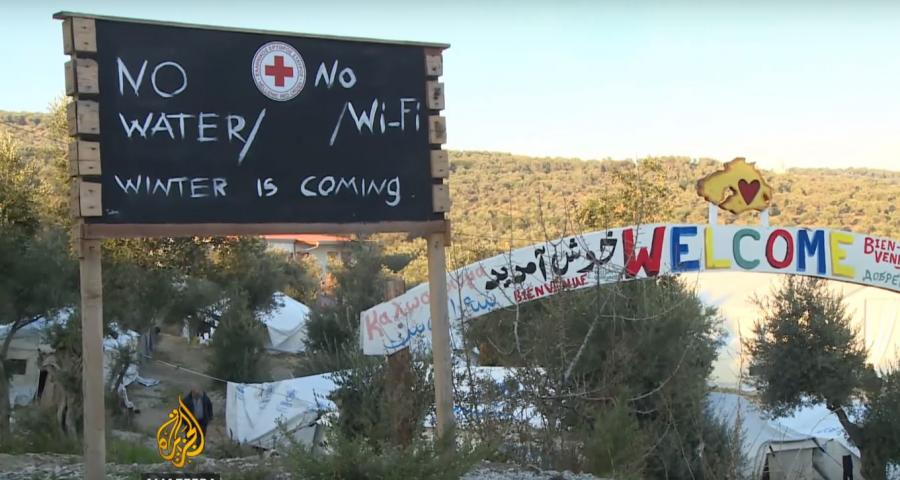 Όσο ακούμε την κ. Ntanika, η κάμερα δείχνει το σύνθημα «Καλώς ήρθατε στη Φυλακή», γραμμένο στον τοίχο έξω από το καμπ της Μόριας, κρεμασμένα ρούχα στον σιδερένιο φράχτη και έναν μαυροπίνακα που λέει «όχι νερό, όχι wifi. Ο χειμώνας πλησιάζει».