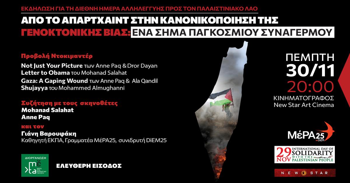 Θα ακολουθήσει συζήτηση με τους σκηνοθέτες Mohanad Salahat και Anne Paq καθώς και τον Γιάνη Βαρουφάκη (καθηγητή ΕΚΠΑ, Γραμματέα ΜέΡΑ25, συνιδρυτή DiEM25)