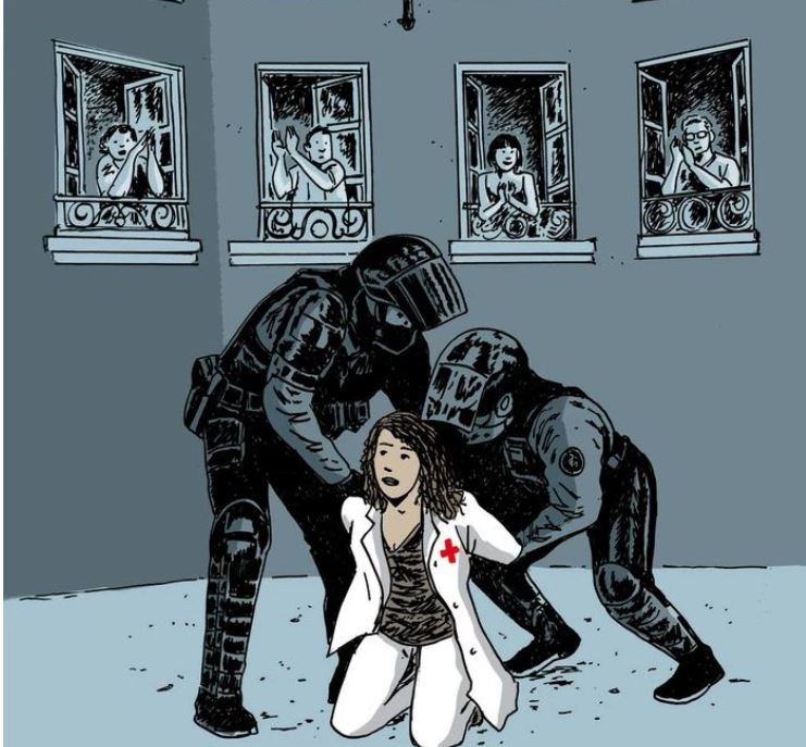«Με αφορμή την σημερινή βίαιη καταστολή της Κυβέρνησης απέναντι στην κινητοποίηση των πρώην «ηρώων γιατρών», προωθούμε ένα σκίτσο από την Γαλλία. Και εκεί, όπως και σε όλη την ΕΕ, αντί για Μέτρα Προστασίας και στήριξης των γιατρών των Δημόσιων Νοσοκομείων, απάντηση των κυβερνήσεων είναι ο αυταρχισμός και η καταστολή» αναφέρει σε ανάρτησή της η Ομοσπονδία Ενώσεων Νοσοκομειακών Γιατρών Ελλάδας (ΟΕΝΓΕ), η οποία στη συνέχεια, σε ανακοίνωσή της καταγγέλλει την απρόκλητη βίαιη επίθεση των δυνάμεων καταστολής με χημικά, γκλομπ και βρισιές σε βάρος αγωνιζόμενων υγειονομικών, στο πλαίσιο της κινητοποίησης στις 30/9 στο Υπουργείο Υγείας ενάντια στις απολύσεις των συναδέλφων επικουρικών.
