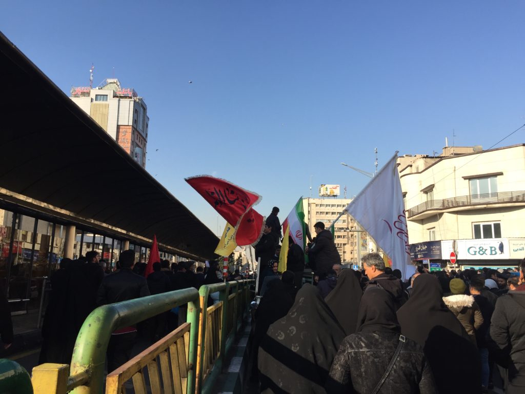 Η πορεία παγώνει για λίγο. Καθυστέρηση, ησυχία, ούτε φωνή. Κάποιος έχει στήσει ένα λάβαρο με τους δύο Αγιατολάχ και τον Σολεϊμανί, οι τρεις φωτογραφίες και μπουκέτα φρέσκα λουλούδια γύρω γύρω, κι όλοι θέλουν μια σέλφι. Κάποτε περνάμε, και το βήμα γίνεται σχεδόν κανονικό. Σταματάω για τσιγάρο και για να δω. Τα πρόσωπα. Το λαό του.
