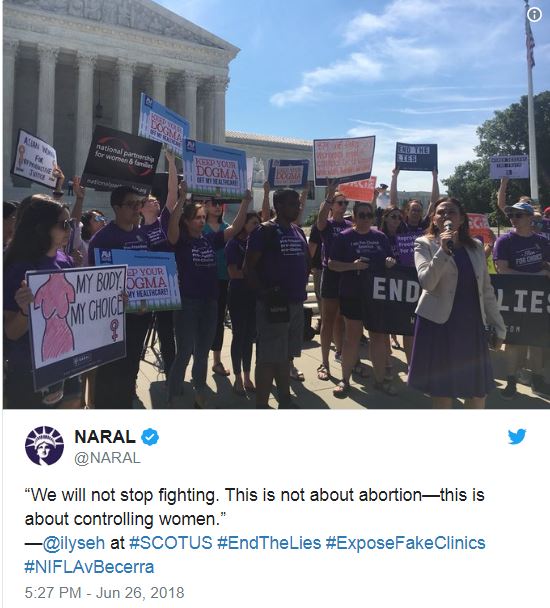 Την κατάργηση νόμου της Καλιφόρνια ο οποίος επέβαλλε σε κλινικές με την ονομασία «crisis pregnancy center» να ενημερώνουν τις έγκυες πελάτισσές τους ότι μπορούν να υποβληθούν σε άμβλωση ή να λάβουν αντισυλληπτικά μέσα δωρεάν ή σε χαμηλές τιμές σε επιδοτούμενους από το κράτος οργανισμούς, αποφάσισε το Ανώτατο Δικαστήριο των ΗΠΑ. Οι εν λόγω κλινικές στηρίζονται από χριστιανικές ομάδες οι οποίες τάσσονται κατά των αμβλώσεων. Οργανώσεις για τα δικαιώματα των γυναικών δήλωσαν ότι «δεν θα σταματήσουμε να αγωνιζόμαστε -πρόκειται για τον έλεγχο των γυναικών».