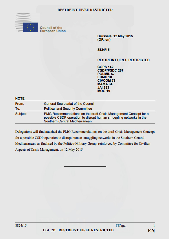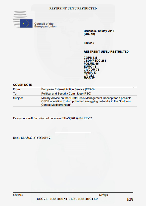 Το πρώτο έγγραφο 11 σελίδων με ημερομηνία 12 Μαΐου 2015 αποτελεί εσωτερικό έγγραφο της υπηρεσίας Εξωτερικών Δράσεων του Ευρωπαϊκού Συμβουλίου (EEAS) προς την Επιτροπή Πολιτικής και Ασφάλειας (PSC). Σε αυτό γίνεται λόγος για σχέδιο ανάπτυξης στρατιωτικών δυνάμεων στη Λιβύη που θα επιχειρήσουν εναντίον πολιτικών στόχων εντός της χώρας προκειμένου να καταστραφούν οι υποδομές που χρησιμοποιούνται από τους πρόσφυγες για να ταξιδέψουν προς την Ευρώπη.