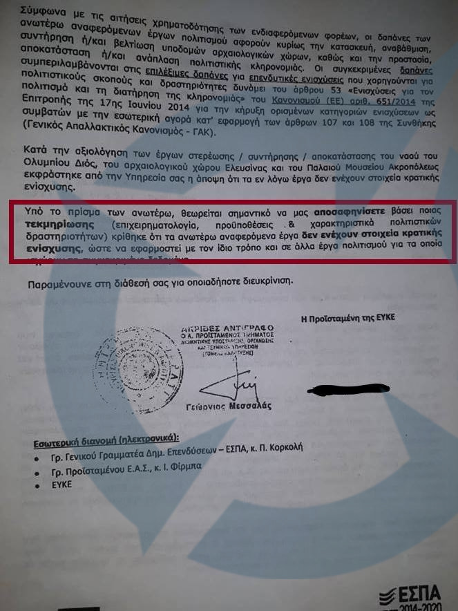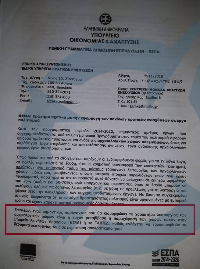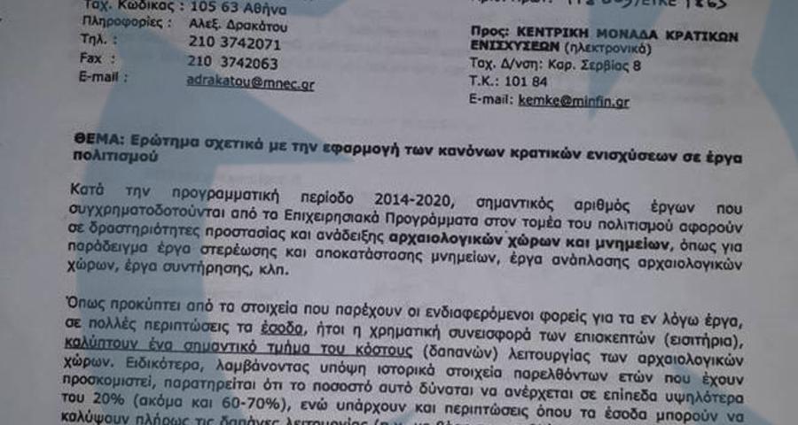 Το έγγραφο, με ημερομηνία 6/11/2018, Αρ. Πρωτ. 118009/ΕΥΚΕ 1865 και θέμα «Ερώτημα σχετικά με την εφαρμογή των κανόνων κρατικών ενισχύσεων σε έργα πολιτισμού», αναφέρεται σε έργα προστασίας και ανάδειξης αρχαιολογικών χώρων και μνημείων, σημειώνοντας πως, δεδομένου ότι οι χώροι αυτοί έχουν σημαντικά έσοδα από τα εισιτήρια των επισκεπτών, «διαφαίνεται πως οι εν λόγω δραστηριότητες πολιτισμού είναι οργανωμένες με εμπορικό τρόπο και έχουν χαρακτήρα οικονομικής δραστηριότητας». Με βάση τη διαπίστωση αυτή τίθεται και το ερώτημα για το αν θα πρέπει να εντάσσονται τέτοια έργα (στερέωσης και αποκατάστασης μνημείων, ανάπλασης αρχαιολογικών χώρων, συντήρησης κοκ) στα συγχρηματοδοτούμενα από τα Επιχειρησιακά Προγράμματα έργα της προγραμματικής περιόδου 2014-2020!