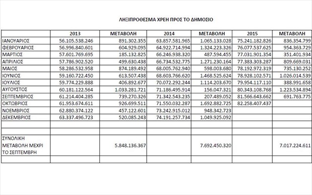 Η συνολική αύξηση του ληξιπροθέσμου υπολοίπου κατά την περίοδο 1/1/2015-30/9/2015 υπολογίζεται σε 7,02 δισ., ενώ η μεταβολή της αντίστοιχης περιόδου του προηγούμενου έτους είχε διαμορφωθεί σε 7,69 δισ. (η επιβάρυνση του προηγούμενου έτους ήταν κατά 9,5% μεγαλύτερη σε σχέση με την αντίστοιχη του τρέχοντος έτους).