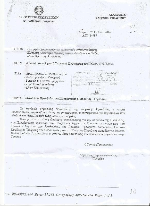 Η Πρεσβεία λοιπόν ζητά από το Υπουργείο Εξωτερικών της Ελλάδας να μεσολαβήσει στις Ελληνικές Αρχές, ώστε οι ένοχοι να οδηγηθούν στη Δικαιοσύνη, να εμποδιστεί η επανάληψη τέτοιας επίθεσης στο μέλλον και να αυξήσει τα μέτρα ασφαλείας για τις Τουρκικές διπλωματικές και προξενικές αποστολές στην Ελλάδα και άλλους φορείς τουρκικών συμφερόντων, που βρίσκονται στην Ελλάδα΄΄.