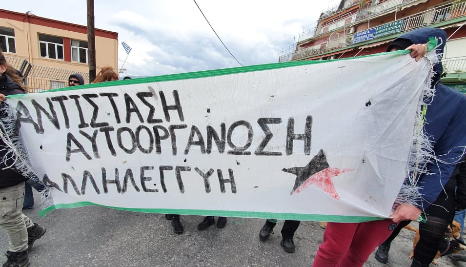 Συμπορευτήκαμε με μπλοκ που οδηγούσε ένα πανό με το σύνθημα «Αντίσταση, Αυτoοργάνωση, Αλληλεγγύη», και συνθήματα όπως«Λέσβος γη αντιφασιστική»,«Η αλληλεγγύη το όπλο των λαών» και στην επιστροφή βρεθήκαμε σε συγκέντρωση συμπαράστασης στον περιφερειάρχη Βορείου Αιγαίου, που μόλις είχε εμφανιστεί για να κάνει δηλώσεις.