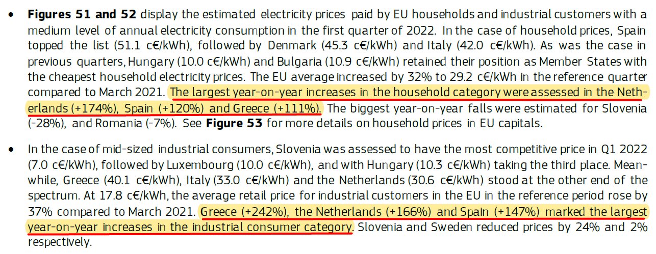 Σύμφωνα με τη σχετική έκθεση της Ευρωπαϊκής Επιτροπής η Ελλάδα είναι στην πρώτη θέση στην Ε.Ε. στις τιμές προμήθειας προς τις επιχειρήσεις και τρίτη για τα νοικοκυριά, με αύξηση κατά 242%. Σε ό,τι αφορά τη χονδρεμπορική τιμή ηλεκτρικής ενέργειας η χώρα είναι η τρίτη ακριβότερη χώρα στην Ε.Ε. Σύμφωνα με το Παρατηρητήριο Αγοράς Ενέργειας της Γενικής Διεύθυνσης Ενέργειας η Ελλάδα στο διάστημα Ιανουαρίου – Μαρτίου 2022 ήταν η τρίτη ακριβότερη χώρα στην ΕΕ, στη χονδρεμπορική τιμή ηλεκτρικής ενέργειας.