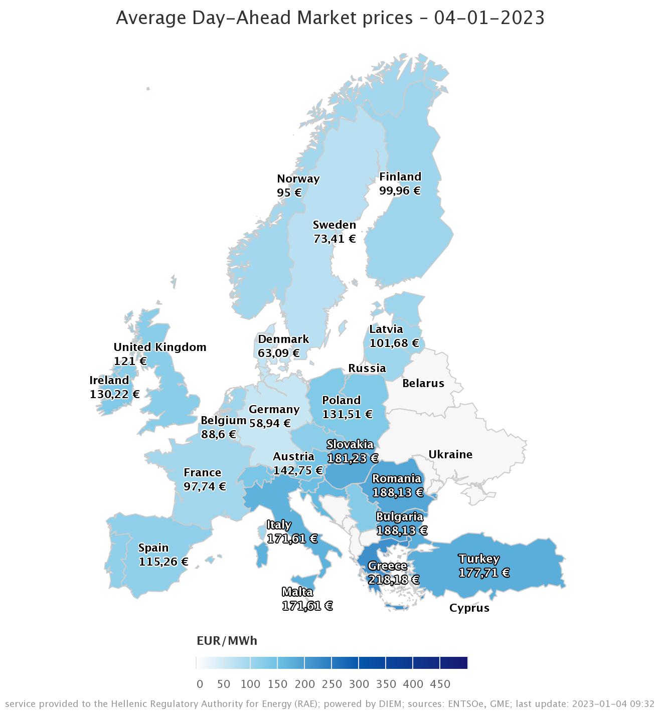 Σταθερά εδώ και 15 ημέρες η Ελλάδα είναι η πιο ακριβή στην Ευρώπη στη χονδρεμπορική τιμή ρεύματος με 218,18 ευρώ ανά μεγαβατώρα. Μάλιστα, σύμφωνα με τον χάρτη που δημοσιεύει καθημερινά η Ρυθμιστική Αρχή Ενέργειας, η διαφορά με τις δεύτερες Βουλγαρία και Ρουμανία ξεπερνά τα 30 ευρώ. Την ίδια ώρα, η γειτονική Ιταλία αγοράζει τη μεγαβατώρα με 171,61 ευρώ, στον Βορρά η Νορβηγία με 95 ευρώ, η Φινλανδία με 99,96 και η Σουηδία με 73,41 ευρώ, ενώ η Γερμανία έχει τη χαμηλότερη τιμή με μόλις 58,94 ευρώ.
