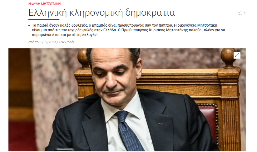 Στο άρθρο με τίτλο «Ελληνική κληρονομική δημοκρατία» η εφημερίδα ασχολείται με την «δυναστεία Μητσοτάκη», σημειώνοντας ότι ξεκίνησε από το «Ξυπόλητο Κόμμα», του προπάππου του σημερινού πρωθυπουργού, για να φτάσει στο σήμερα με τον Κ. Μητσοτάκη.  Στο κείμενο αναφέρεται ότι η οικογενειοκρατία και ο νεποτισμός παραμένουν σταθερά αγκυροβολημένα στην ελληνική πολιτική σκηνή, 200 χρόνια μετά την απελευθέρωση και περισσότερο από 40 χρόνια μετά την ένταξη της χώρας στην Ε.Ε., ενώ σημειώνεται ότι το φαινόμενο αυτό «ευνοεί και άλλους συγγενείς, γνωστούς ή κολλητούς, προσφέροντας στους φίλους καλές δουλειές και την ανείπωτη πελατεία που την συνοδεύει. Είτε παγκόσμιοι πόλεμοι, είτε περιφερειακοί πόλεμοι, είτε εμφύλιος, είτε κρατικές χρεοκοπίες: Στην Ελλάδα η “οικογενειοκρατία” δεν μπορεί να εξαλειφθεί. Μάλλον έτσι θα παραμείνει».