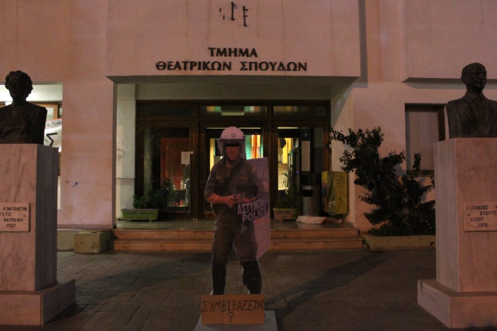 Σε μία πρωτότυπη και εξαιρετικά συμβολική παρέμβαση, στα πλαίσια των κυβερνητικών επιλογών, προχώρησαν φοιτήτριες και φοιτητές της Σχολής Καλών Τεχνών του Ναυπλίου, που τοποθέτησαν ένα ομοίωμα αστυνομικού των ΜΑΤ σε διάφορα σημεία της πόλης, όπως δημόσιους χώρους, φαρμακεία, νοσοκομείο, σχολεία.