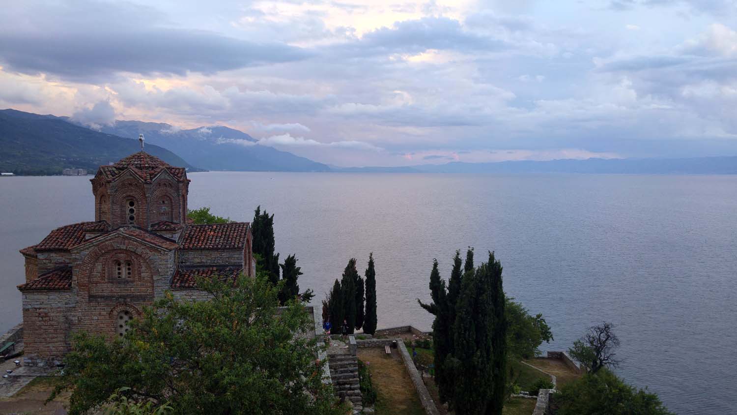 Παρακάμπτοντας το Πόγραδετς, περάσαμε τα σύνορα από τη νότια πλευρά τής λίμνης, και αμέσως βρεθήκαμε στο μοναστήρι του Αγίου Ναούμ με τα παγώνια – η παλαιοχριστιανική εκκλησία του, από πέτρα και κόκκινο κεραμίδι, στον βαλκανικό ρυθμό με τους δυο ανισόπεδους τρούλους, ένα μικρό αριστούργημα. Από κάτω, η λίμνη στραφτάλιζε στο μισόφωτο του δειλινού και χανόταν σαν θάλασσα στον ορίζοντα, που επίσης χανόταν σε πυκνούς υδρατμούς. Μπαίναμε σε ένα καταπληκτικό οικοσύστημα.